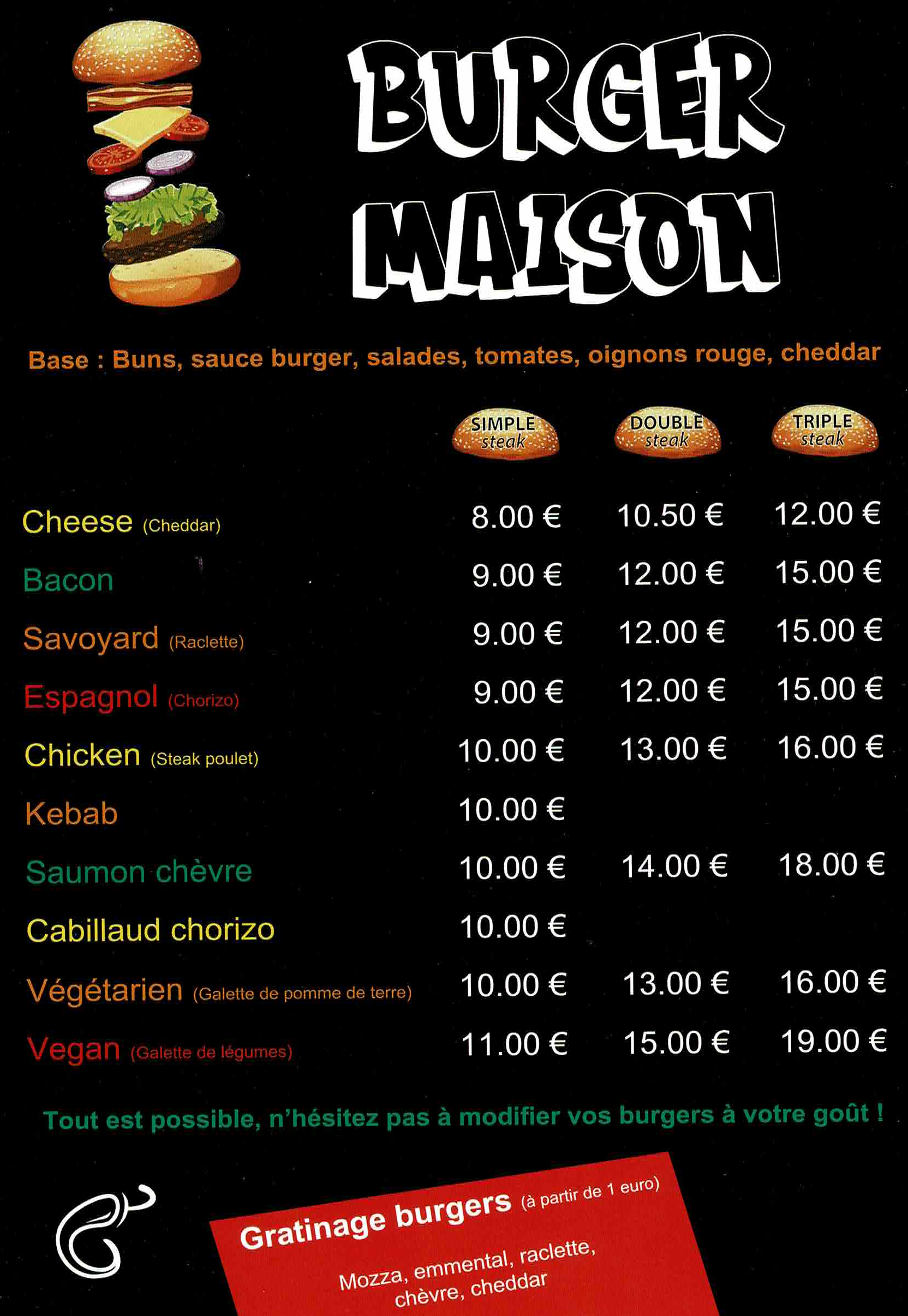 Imaginez une soirée burger où chaque bouchée est une explosion de saveurs. Commencez par le classique cheeseburger avec son fromage fondant et sa viande juteuse. Ajoutez-y du bacon croustillant pour un bacon burger irrésistible. Pour une touche montagnarde, optez pour le Savoyard garni de fromage à raclette et de lardons.