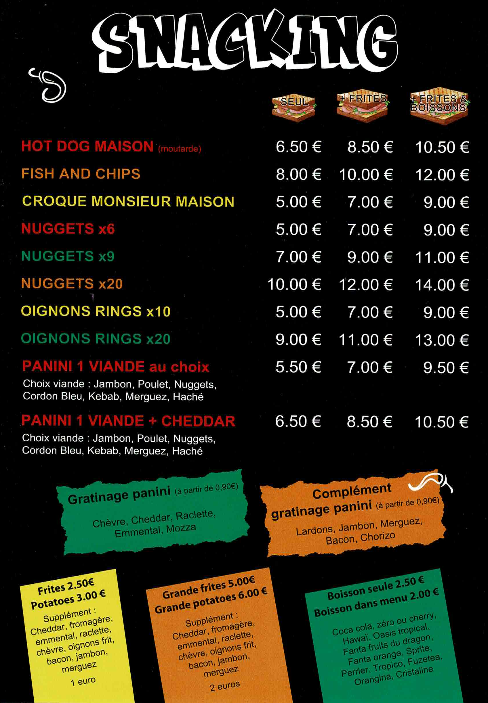 Pour les petites faims : des paninis gourmands seuls ou en menu avec des frites et des boissons